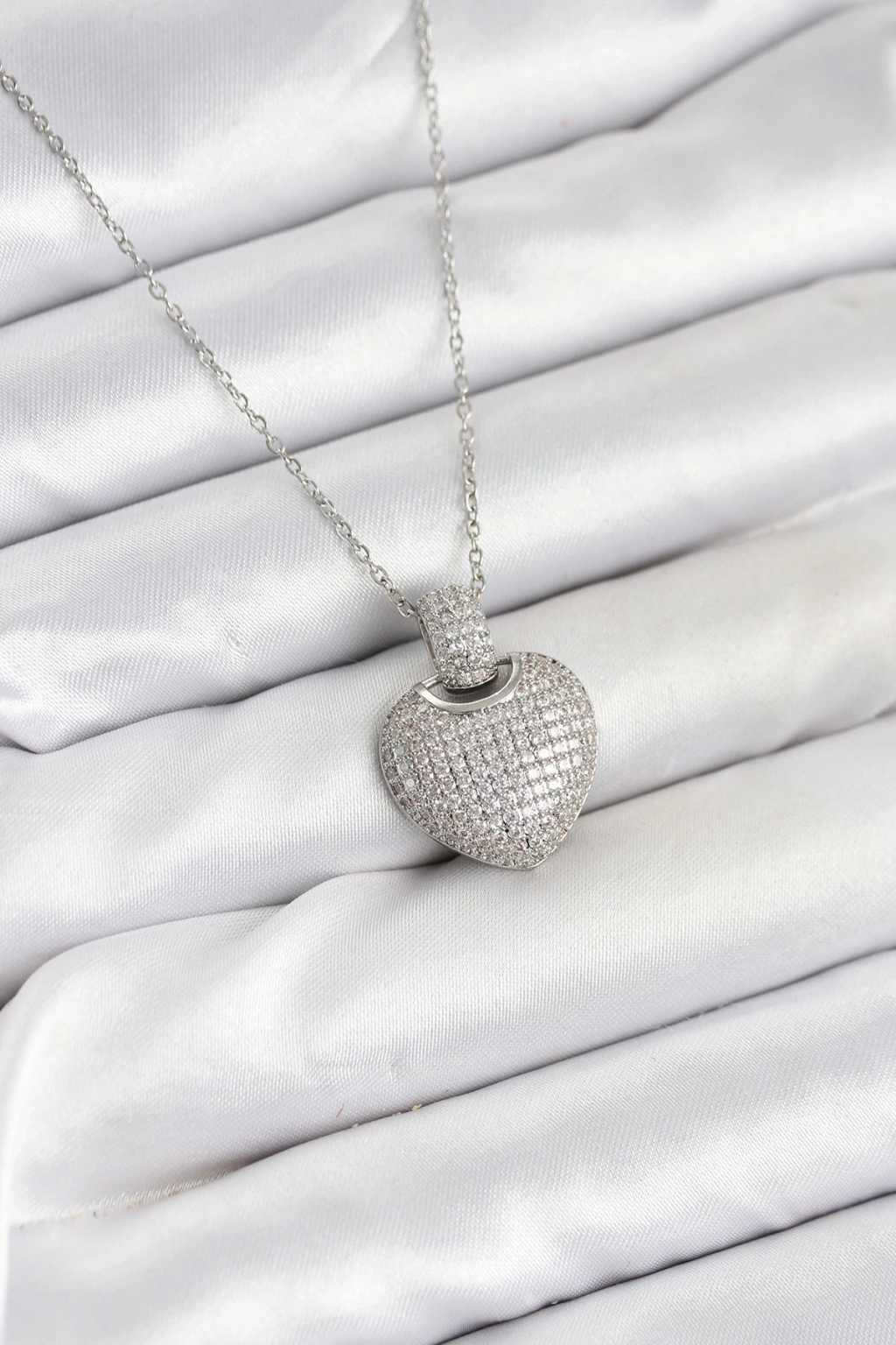 316L Çelik Zincir Gümüş Zirkon Taşlı Kalpli Kadın Kolye
