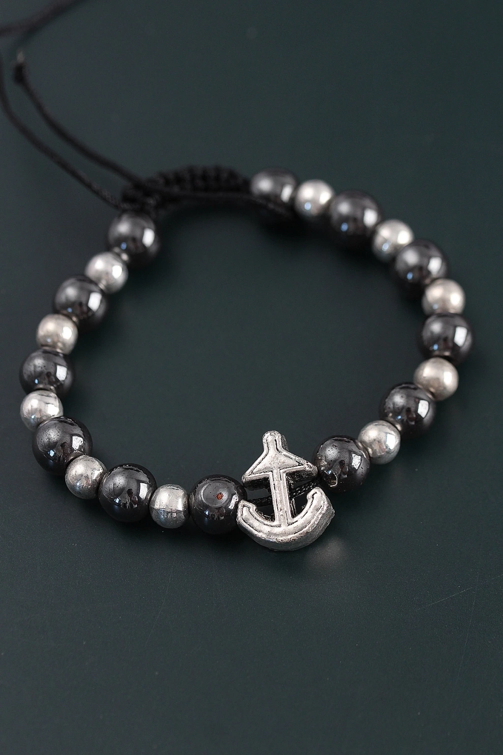 Doğal Taş Çapa Model Gümüş Ve Füme Renk Asansörlü Erkek Bileklik