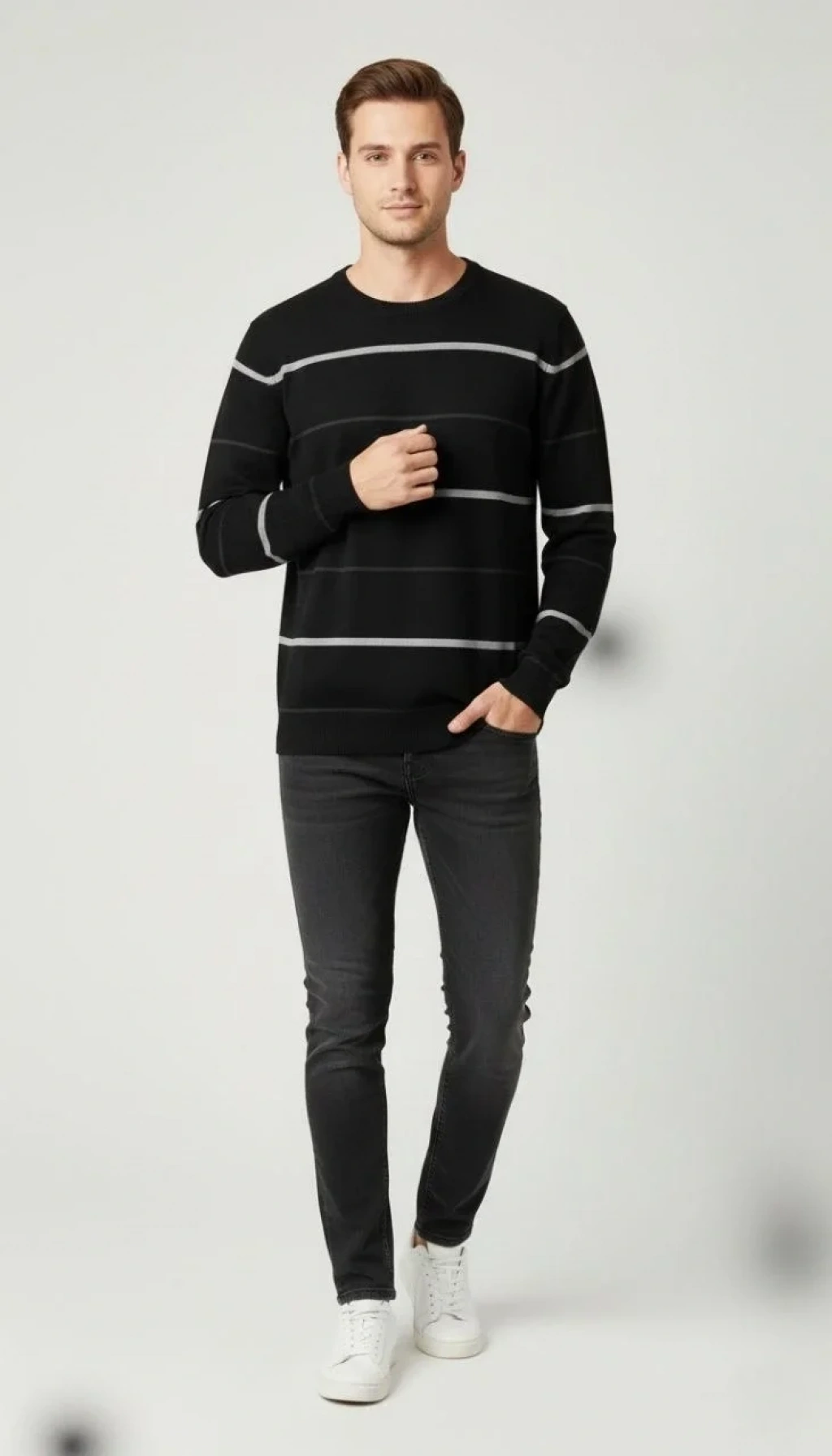 Erkek Bisiklet Yaka Cizgili Triko Kazak yumuşak dokulu Pamuklu ince Dokuma, uzun kollu Rahat Regular kalıp - Siyah