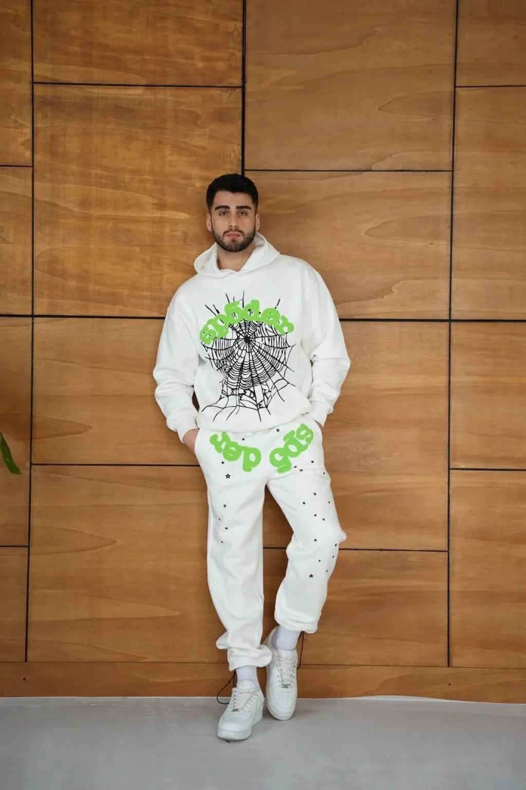 Erkek Kapüşonlu Eşofman Takım Örümcek Ağı ve Neon Yeşil Baskılı Kanguru cepli Oversize Rahat Kalıp, Premium Üç İplik Kumaş - Beyaz