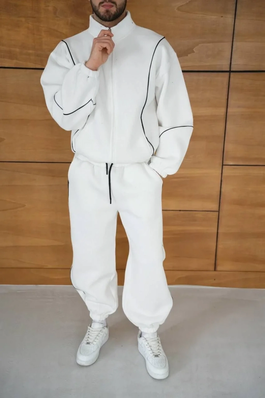 Erkek Premium Parçalı Eşofman Takım - Dik Yaka Fermuarlı Biyeli Sweatshirt Lastik Paça Alt, Oversize 3 iplik Şardonlu - Beyaz