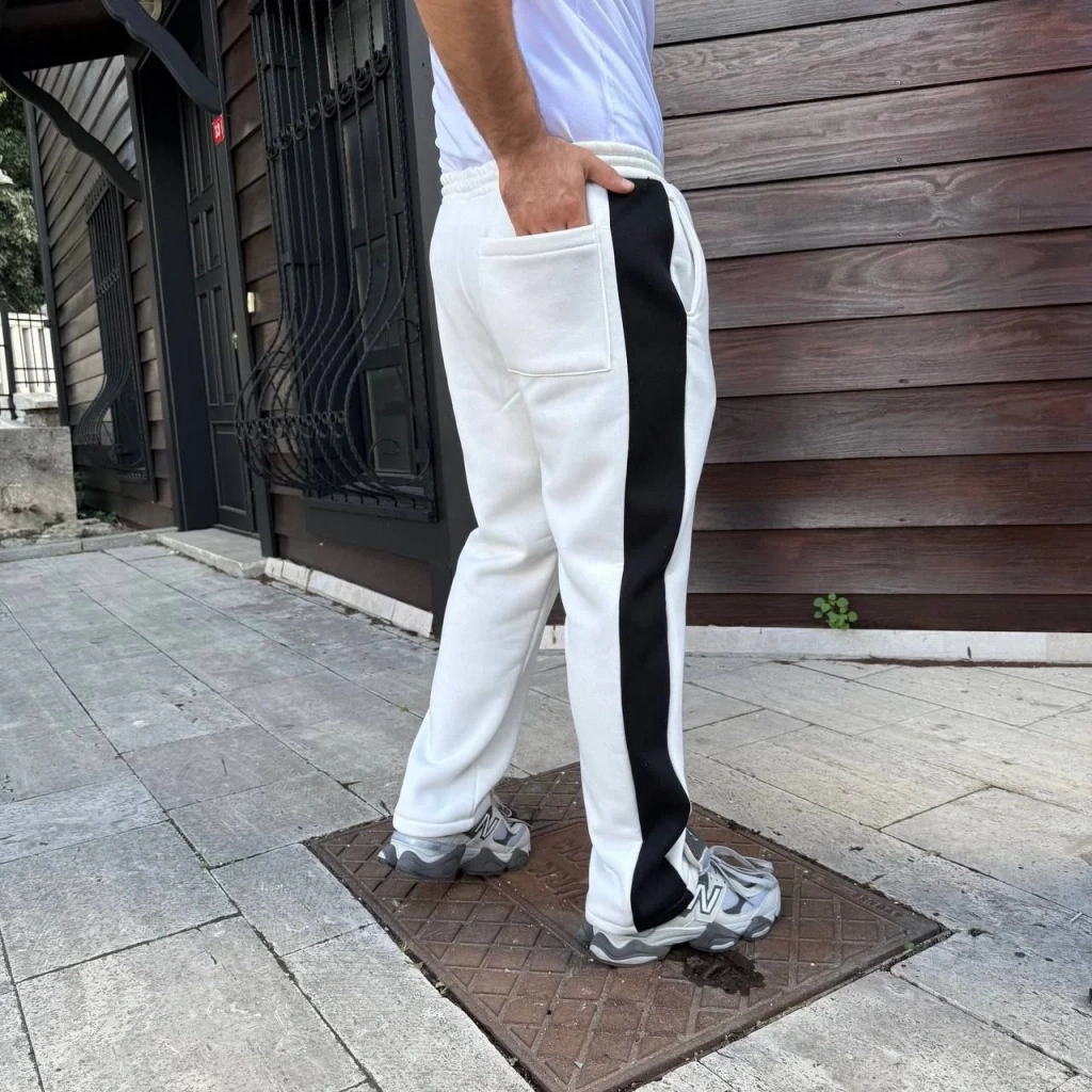 Erkek Üç İplik Kışlık Pamuklu Yandan Garneli Kalın Şeritli Cepli Eşofman Altı - Beyaz