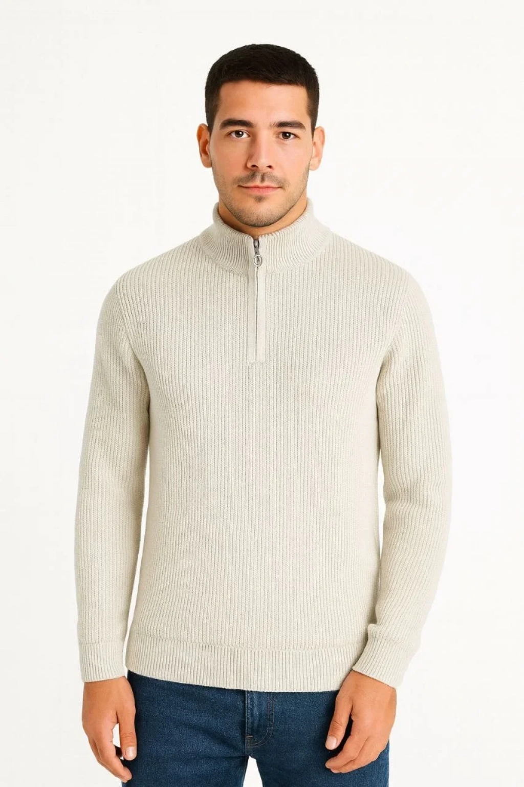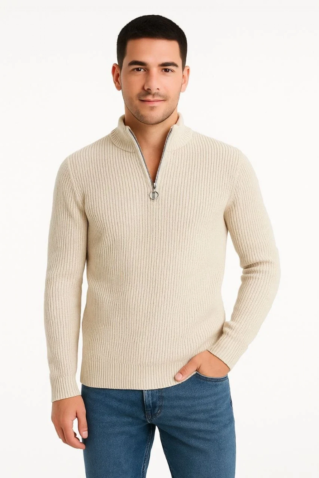 Erkek Yarım Fermuarlı Triko Kazak – Selanik Örgü, Dik Yaka, Pamuklu Dokuma, Regular Fit Uzun Kollu Kışlık Model - Bej