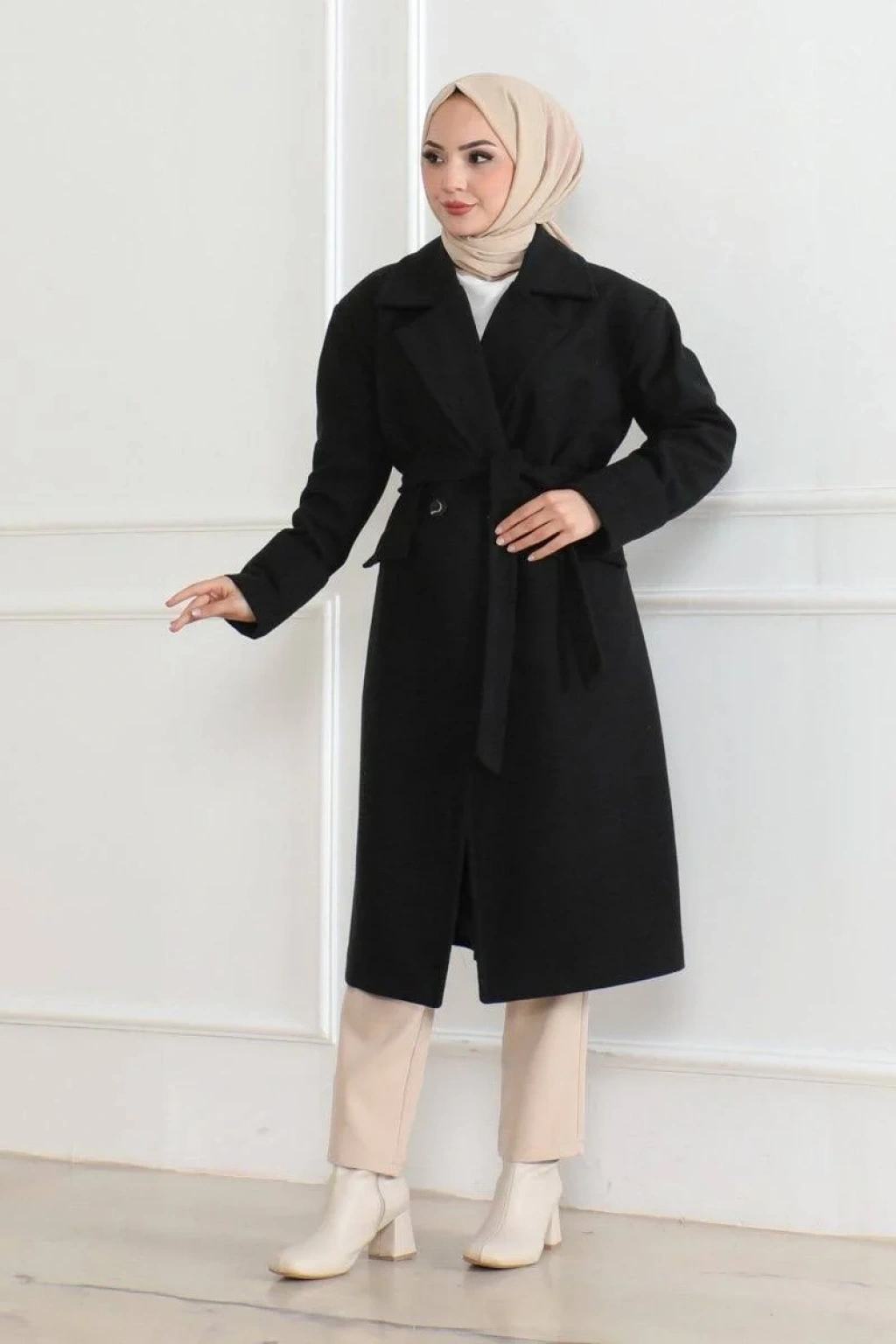 Kadın Düğmeli İçi Astarlı Kaşmir Kaşe Kaban - Siyah
