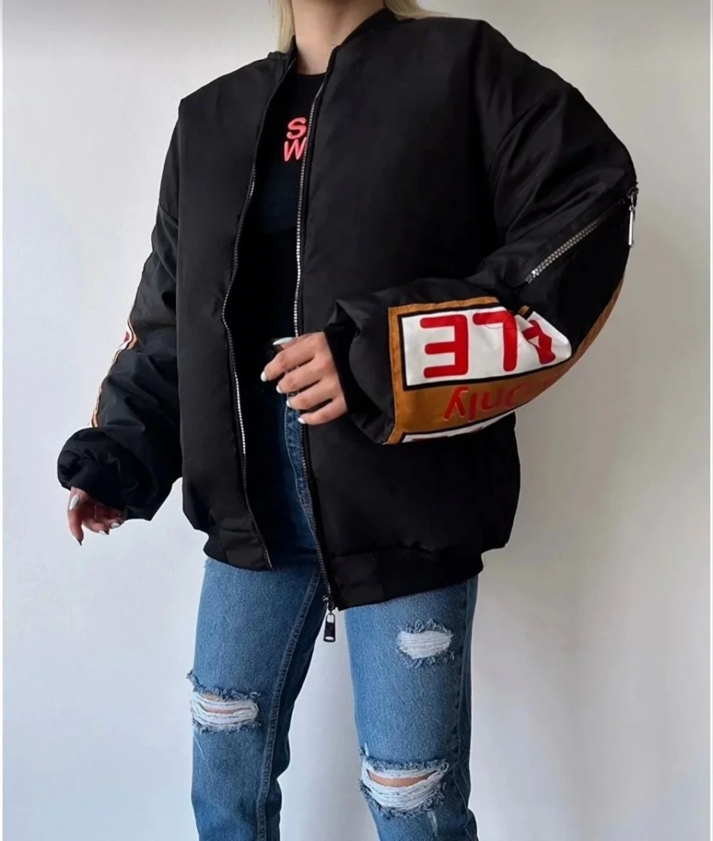 Kadın Sırt ve Kol Parça Baskılı Bomber Ceket - Siyah