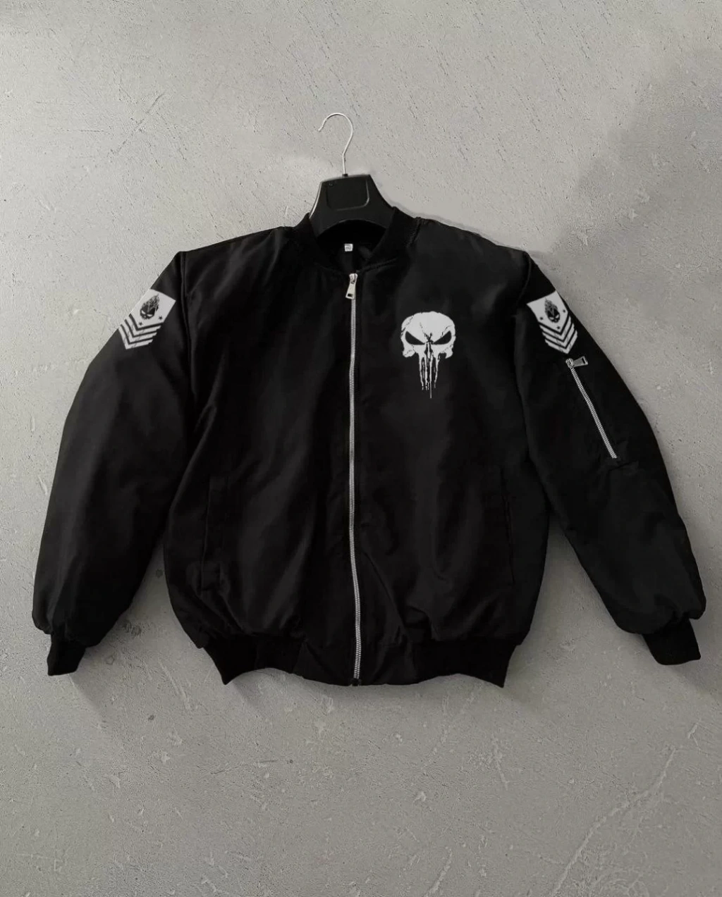 Siyah Askeri Tarz Bomber Mont – Unisex, Punisher Skull Detaylı, Fermuarlı, Cepli, Uzun Kollu, Bahar ve Kış Günlük Moda İçin Uygun - Siyah
